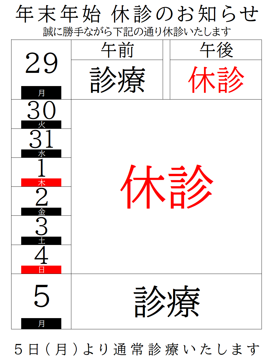 年明けは1月5日より診療開始となりますので、どうぞよろしくお願いいたします
